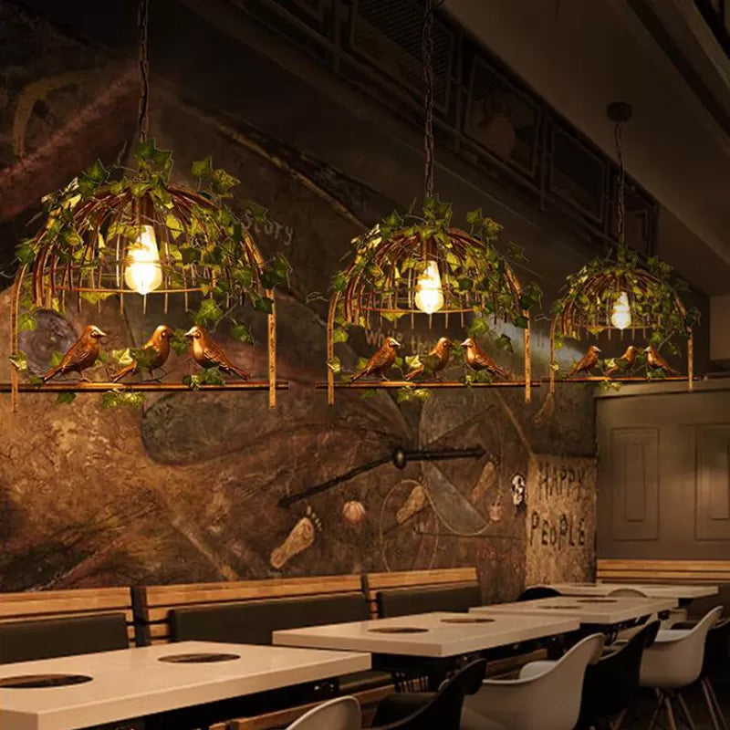 Lodge Style Hanging Birdcage Pendant Light Fixture With Iron Dome Shade - Rust/Black