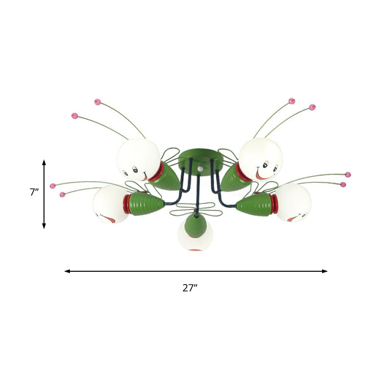The Lovely Green Semi Flush Mount Light is perfect for a child's bedroom, nursery, or playroom. It features a fun and whimsical bee design cast in metal with a green finish. The light requires five E26/E27 bulbs (not included) and comes with a matching ceiling canopy. The light is 7 inches in height and 23.5 inches in width. It is UL listed and approved for use in the United States, Canada, and Mexico.