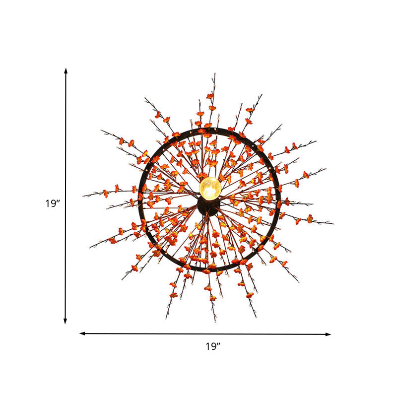 This Metal Black Wall Sconce Wheel is a 1 bulb retro LED wall mount light. It comes with a plum blossom decoration. It is 19 inches tall and has a width of 19 inches. The light type is LED and the maximum bulb wattage is 39 watts. It has a 220V-240V or 110V-120V voltage. It is direct wired electric and has a color temperature of warm. The fixture type is wall lamp.