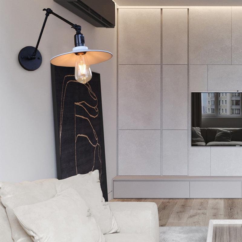 Swing Arm Metal Wall Sconce with Saucer Shade - Black/White, 1 Light Fixture for Living Room