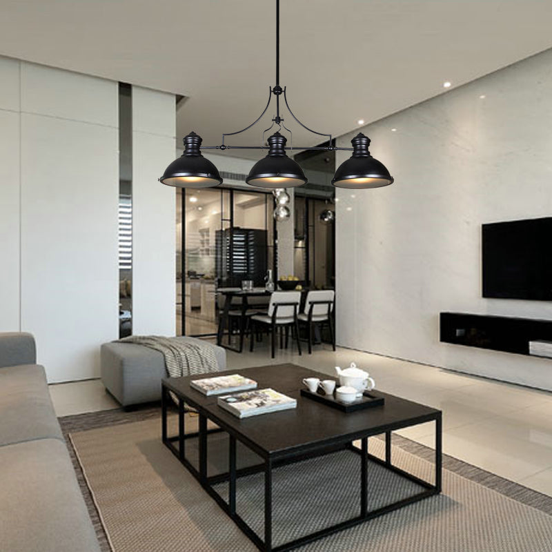 Retro Island Lighting: Metallic Black Hanging Fixture with Dome Shade, Glass Diffuser, and 3 Bulb Design for Tables
