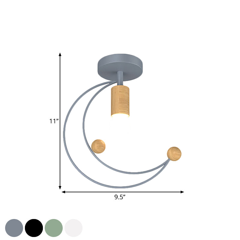 Modern Metallic Crescent Ceiling Light with Wooden Ball Deco - Semi Flush Mount in Black/White/Grey
