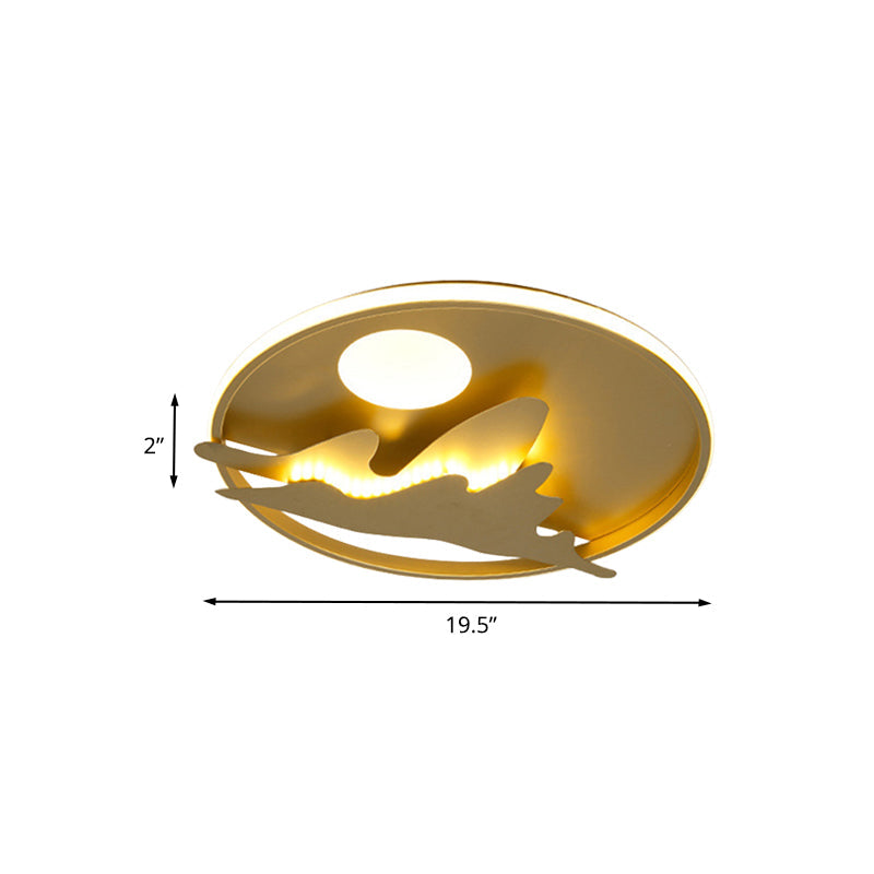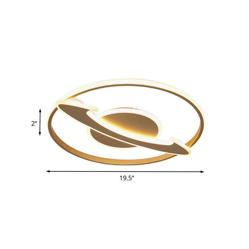 The size of the product is 19-20 inches. The width of the fixture is 19.5 inches, and the height is 2 inches. The bulb included is yes, and the color is gold. The style of the product is kids, and the material is acrylic. The fixture type is flushmount. The voltage is 110v-120v or 220v-240v, and the bulb base is SMD. The light type is LED.