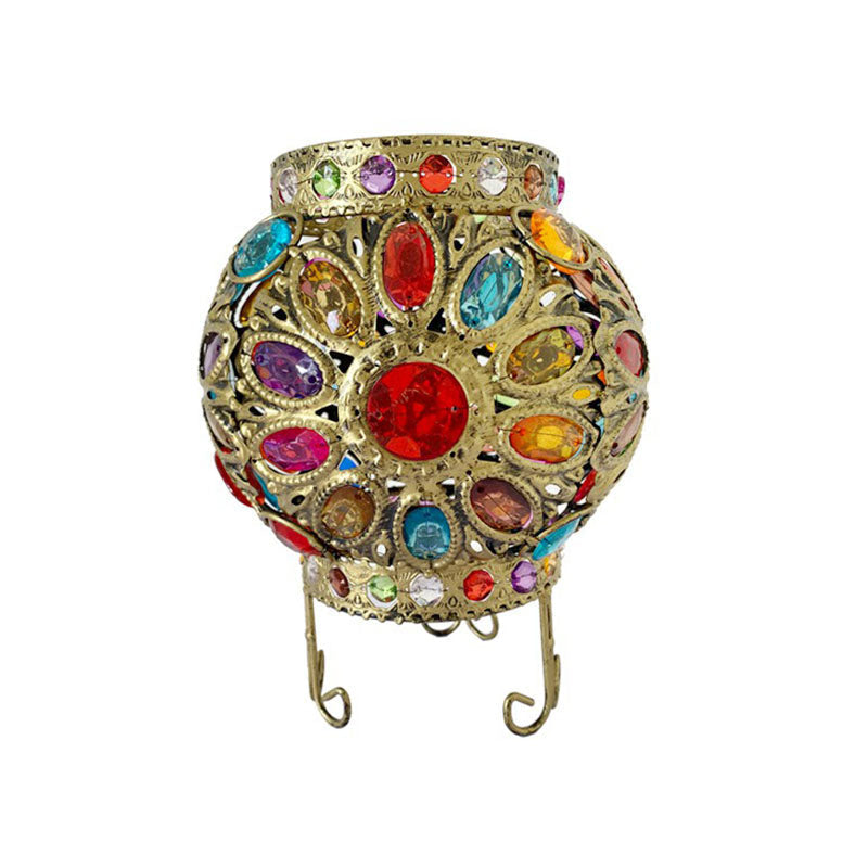 This product is a traditional style floor lamp with an oblate iron body in a bronze finish. The lamp has a single light source that is protected by a globe-shaped shade made of multi-colored acrylic beads. The light type is E12/E14 LED/Incandescent/Fluorescent and the voltage is 220V-240V 110V-120V. The lamp is 8.5" tall and has a 4.5" wide base.