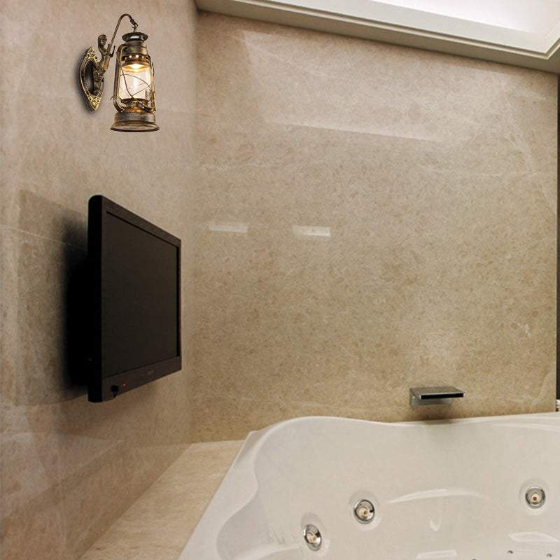 Coastal Bedroom Wall Light With Lantern Shade - Clear Glass Sconce In Black/Antique Brass/Weathered