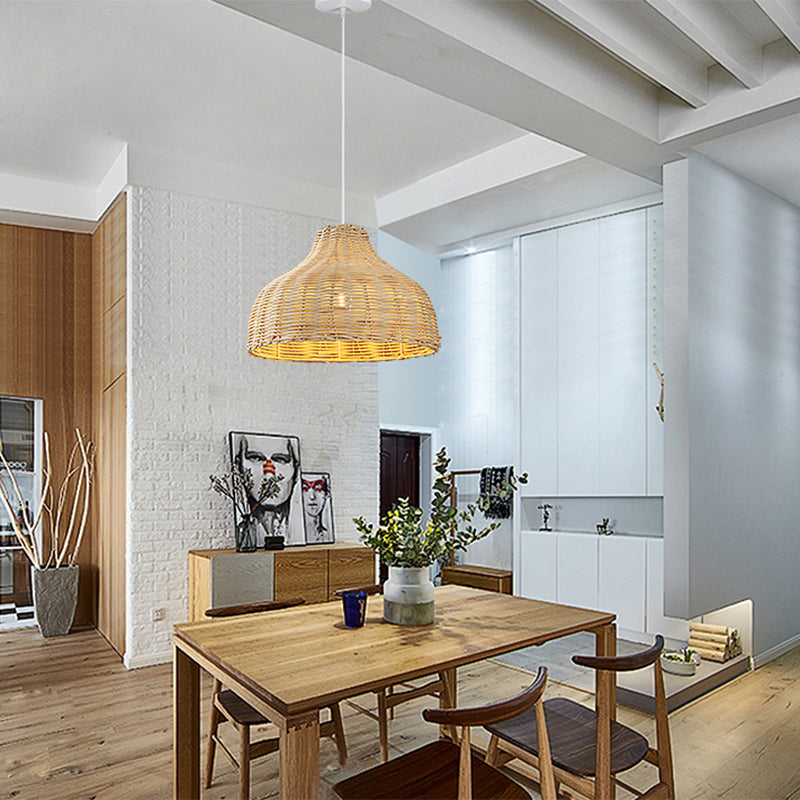 This product is a Pot Cover Restaurant Ceiling Light made from Rattan. It is an Asian Style Hanging light fixture that measures 10 to 14 inches in size. The width of the fixture is 13.5 inches, while the height is 9 inches. The chain or cord length is 39.5 inches. This light does not come with a bulb, however the voltage is 220V-240V 110V-120V and the bulb base is E26/E27. The light type can be either LED/Incandescent/Fluorescent.