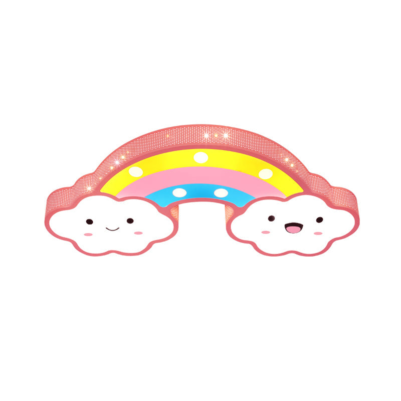This product is the Rainbow Hollowed Out Iron Ceiling Lamp CartoonPink/White/Blue LED Flush Mount Fixture for Kids Room. It is a ceiling light that is fun and perfect for a kids room. It has a pink, white, and blue color scheme that is sure to please any child. The light is LED, making it energy efficient. It is also easy to install.