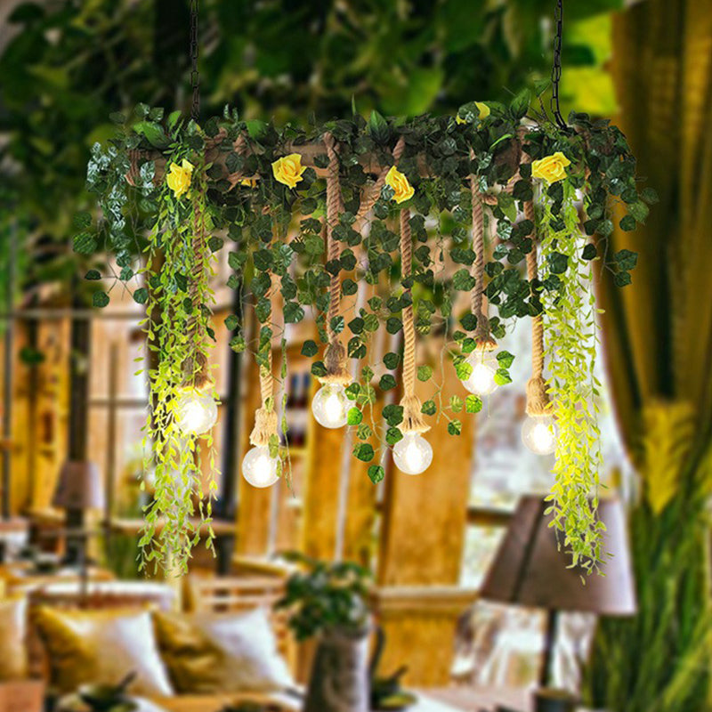 Rustic Iron Hanging Pendant Light Fixture for Restaurants - Rectangular Design with Island Charm and Decorative Fake Plant