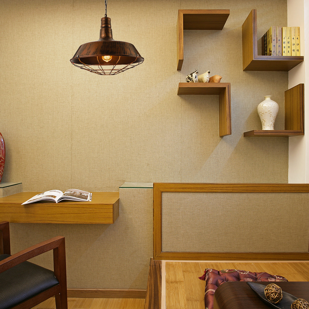 This product is a retro stylish wire guard pendant light with a barn shade. It is made of metal and is available in black, bronze, and rust colors. It is 10"/14"/18" wide and has a 1 light metal hanging fixture. It is also Voltage: 110V-120V 220V-240V. The light type is LED/Incandescent/Fluorescent.