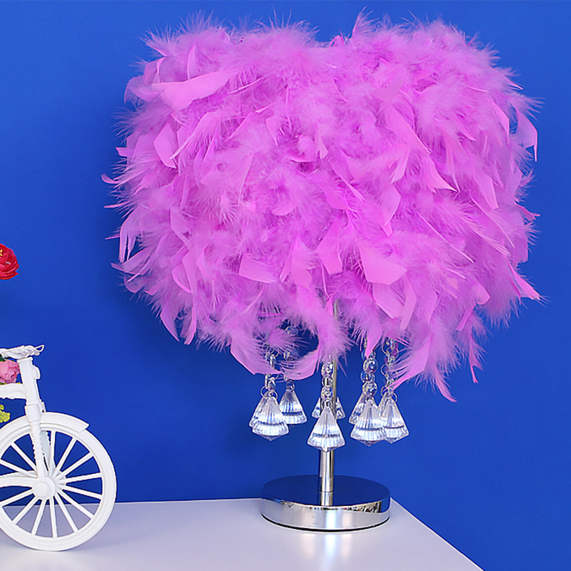 This product is a Round Dining Room Table Light Feather 1 Head Modern Night Lamp in Red/Pink/Rose Red with Crystal Droplet. This product's category is a floor lamp. The lamp has a shade made of metal with a pink, red, or blue color. The light is 1 type of LED/Incandescent/Fluorescent and has a voltage of 110V-120V 220V-240V. The lamp is 16" to 20" inches in height and 14" inches in width. The backplate width is 6" inches. The light bulb is not included but the base is an E26/E27.
