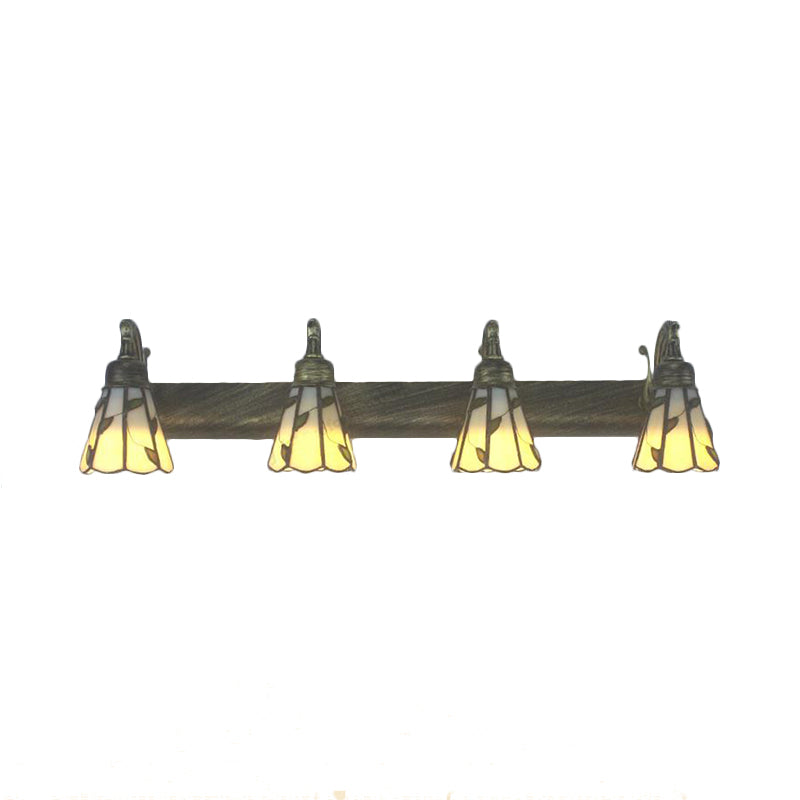 This beautiful wall lamp adds style and sophistication to any room. This lovely fixture features a stunning leaf pattern in stained glass and a vintage copper/antique brass/beige style. The color combination of the three different colors is sure to add a unique and stylish touch. The rustic lamp has four lights and is sized between 20 and 24 inches. This wall sconce is made of high-quality stained glass with a metal frame for durability. With an elegant design, this lamp is sure to be an eye-catching decoration.