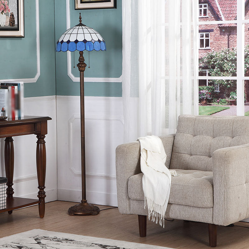 Blue Stained Glass Scalloped Dome Floor Light - 2 Bulb Pull Chain Standing Lamp