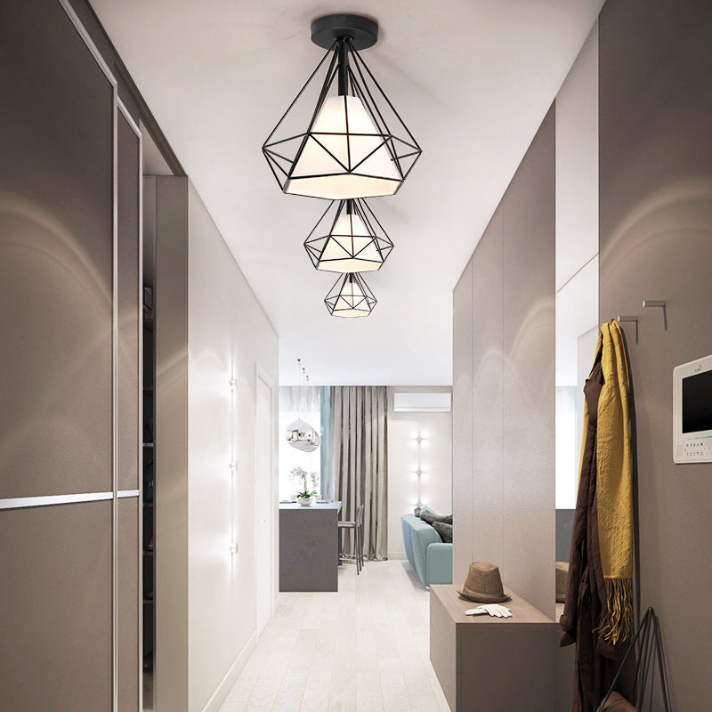 Vintage Diamond Shaped Metal Ceiling Light With Fabric Cone Shade - Single Flush Mount Fixture Black