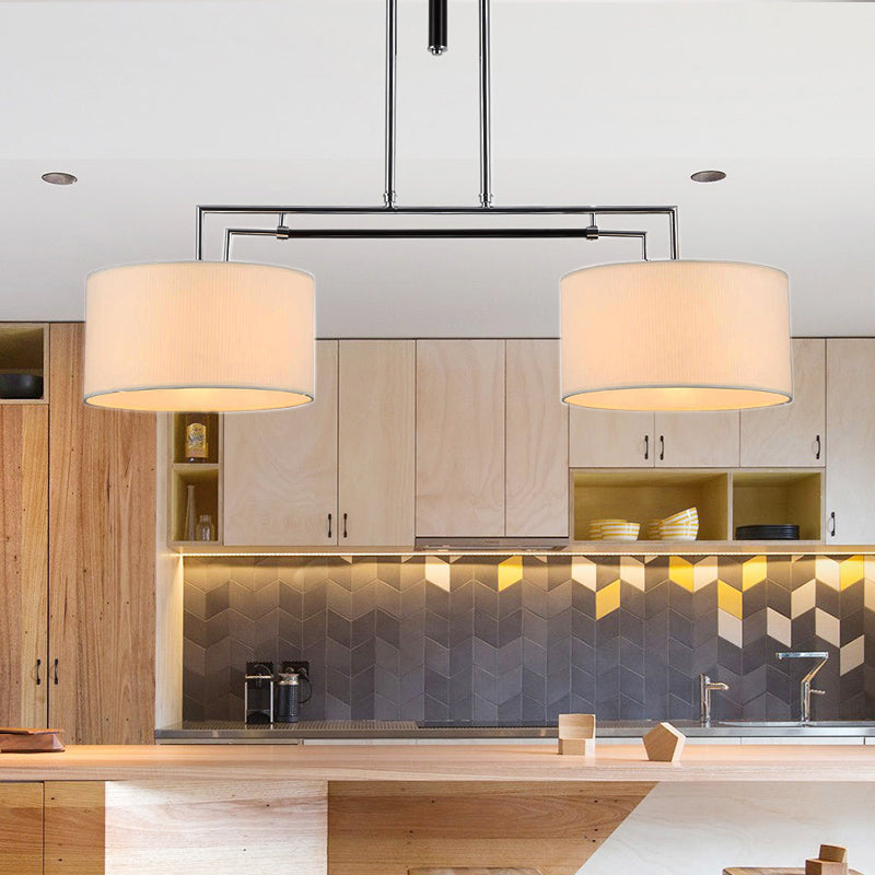 White Fabric Drum Island Pendant with 2 Lights - Traditional Hanging Light Kit for Dining Room