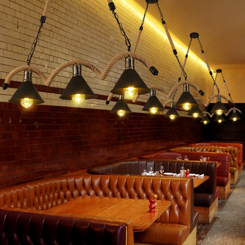 Antique Iron Hanging Island Light With Hemp Rope In Black