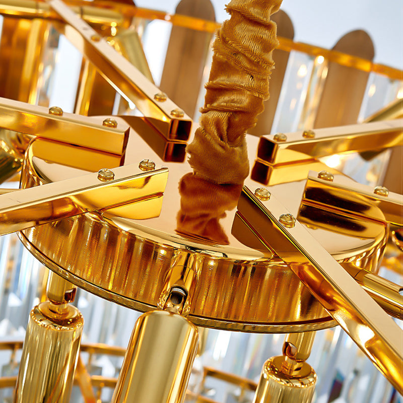 The size of this product is 25 inches or above, its length is 35.5 inches, its fixture width is 14 inches, its fixture height is 17 inches, and its chain or cord length is 19.5 inches. This product does not include a bulb, and it comes in brass color. The shade shape is rectangle, and the material of this product is crystal. This product's style is modern, and it has 8 lights. The voltage of this product is 220-240V or 110-120V. The bulb base of this product is E12/E14, and the light type is LED/incandescent/fluorescent.