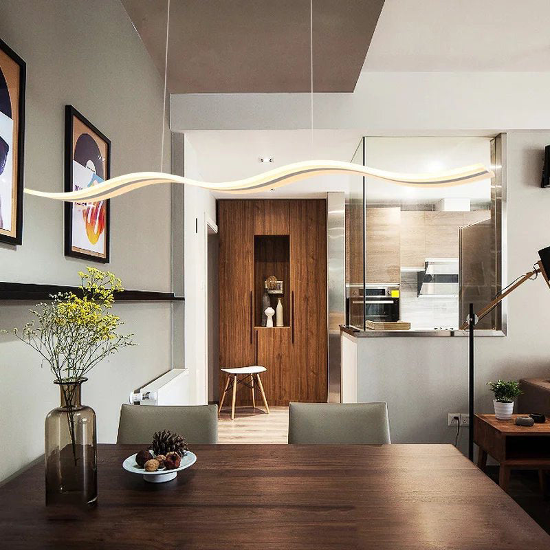 The Wave Shaped Island Pendant Light is a unique and modern ceiling light option for homes and businesses. The light is made out of acrylic and has a sleek, stylish appearance. The Wave Shaped Island Pendant Light is available in three sizes - 35.5", 47", and 59" - and three colors - white, warm natural, and white warm. The light also comes with a built-in LED bulb that is included.