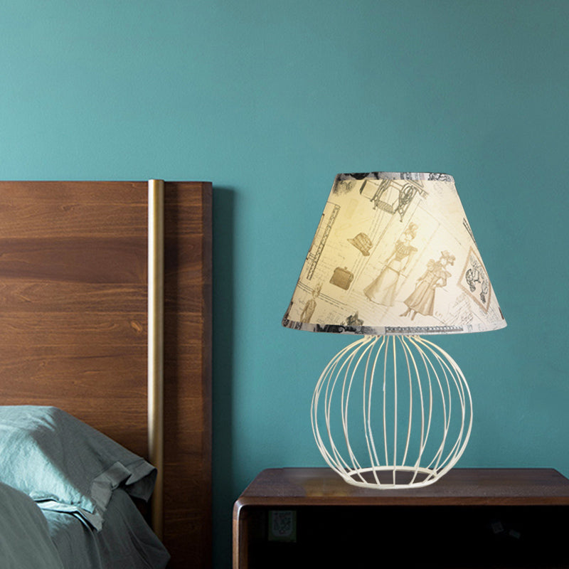 This product is a white, traditional-style desk lamp with a spherical wire cage base. The lamp is made of metal and has a fabric shade. The shade is white and barrel-shaped. The lamp takes one E26/E27 bulb (not included) and is compatible with LED, incandescent, or fluorescent light bulbs. The voltage is 220V-240V 110V-120V.
