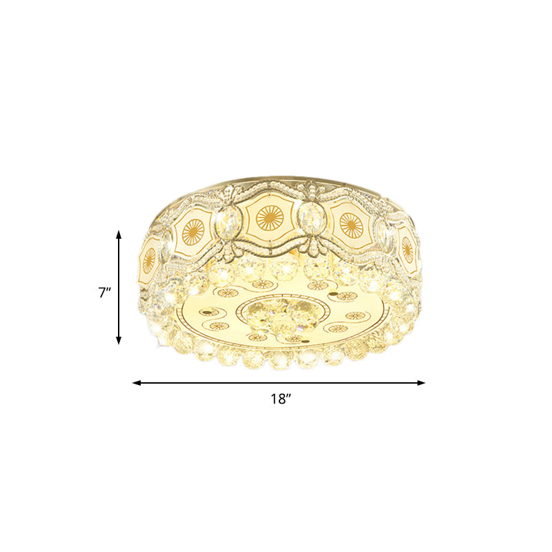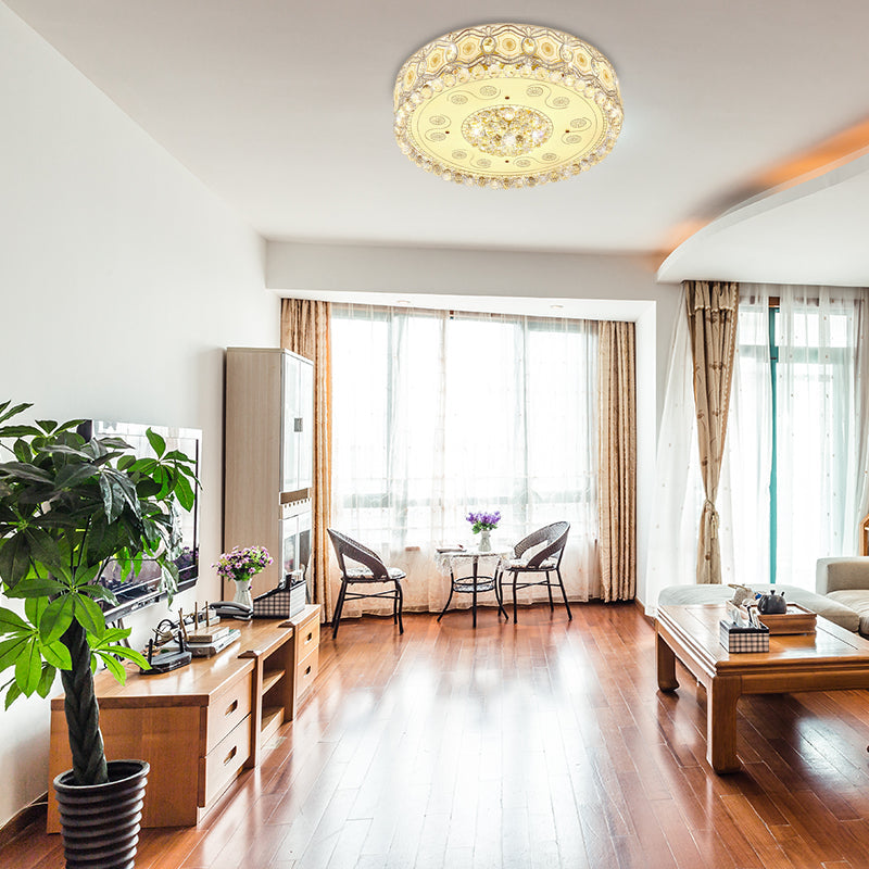 Vintage LED Flush Mount Ceiling Lamp with Etched Design, Clear Crystal Accents, and White Glass Circle