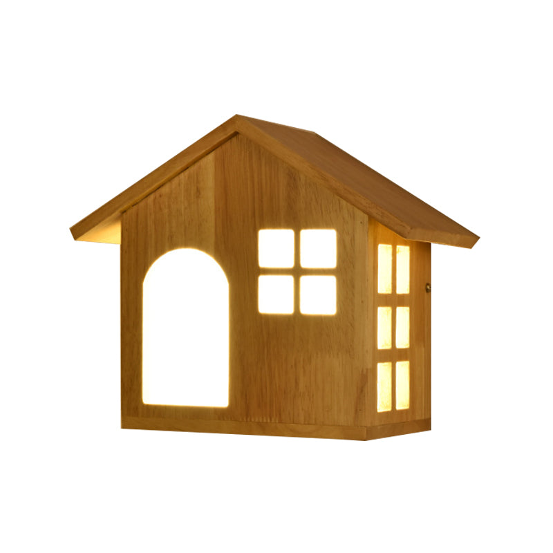 This product is a wall light that is made out of wood. It is in the shape of a house and is meant to be mounted on the wall. The light is beige in color and has a LED light inside of it. The light is operated by a switch on the back of the house. The light is for indoor use only. The product dimensions are 10.5x5.5x9 inches. The light is for kids and has a contemporary design.