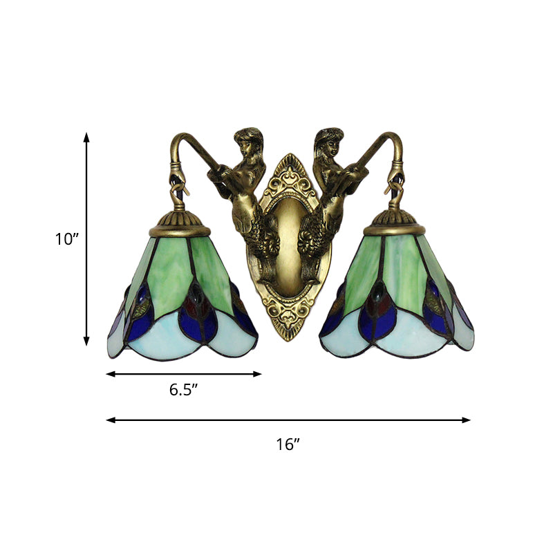 Tiffany Green Glass Cone Sconce Light Fixture With Mermaid Decoration - Yellow Wall Mount 2 Heads